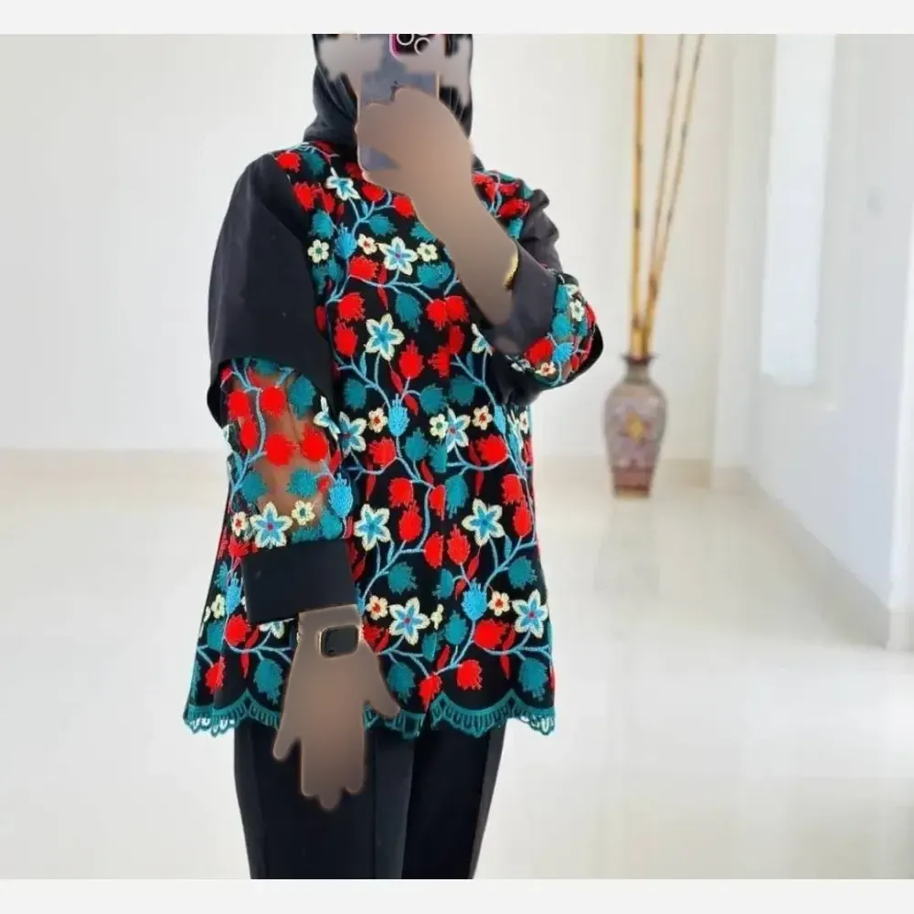 مانتو کتی فری سایز سوزن دوزی شده مازاراتی و تور گلدوزی شده مشکی