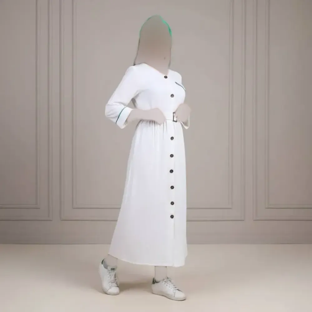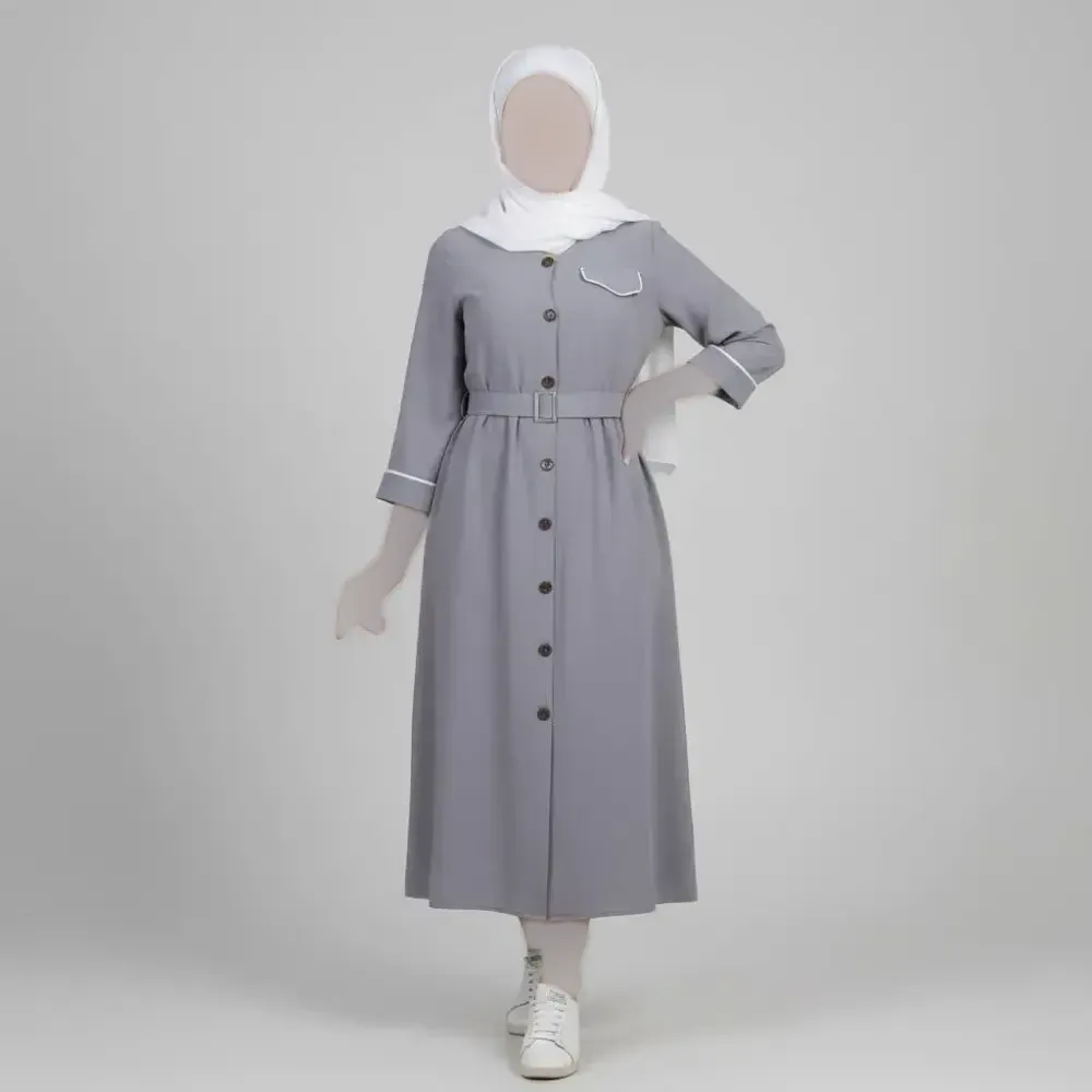 مانتو زنانه طرح سارا ابروبادی قد 118 طوسی سفید سایز 1 تا 4 کمربند دار