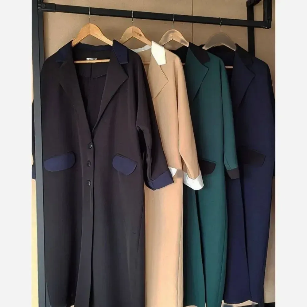 مانتو زنانه طرح مهرنوش مازراتی قد 115 یقه لایی دار دکمه کاربردی چاک پیلی جیب دار در رنگ های سبز مشکی سورمه ای کرم سایز 1 و 2