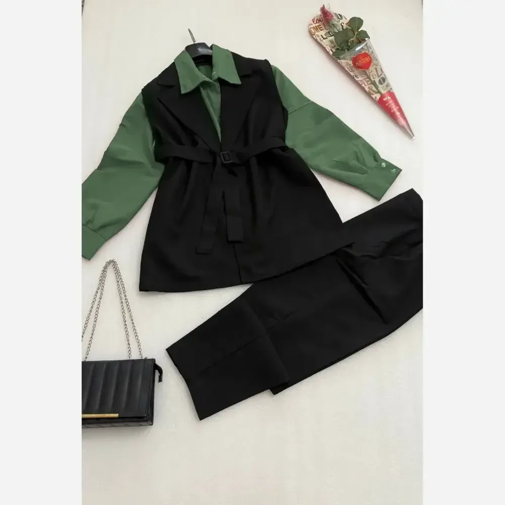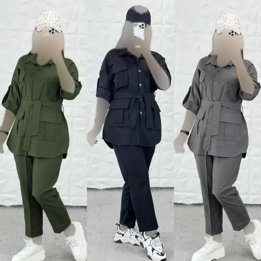 ست چهار تکه سامیتا شومیز، وست، شلوار و کمربند تترون و کتان لنین فری سایز زنانه