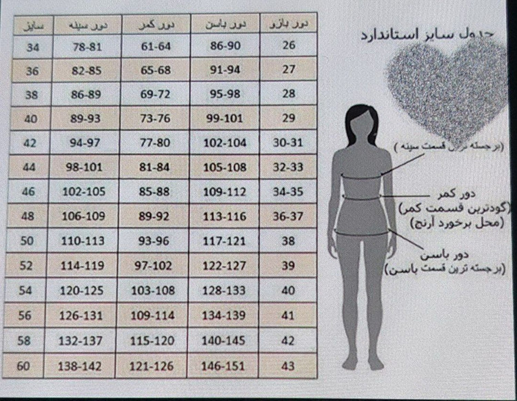 درصورت سفارش لطفا اندازه دورسینه و دورباسن و دور کمر و دور ران و قدکت و قد استین و قد شلوار و فاق شلوار و دور دمپا بفرستید