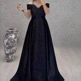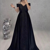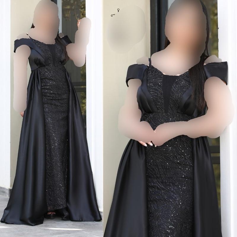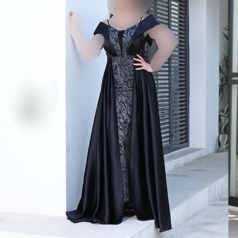 لباس مجلسی زنانه حریر شاین برجسته دنباله ساتن سایز 40 تا 50 مشکی دودی سبز - ماکسی مجلسی فرمالیته نامزدی عقد ساقدوش