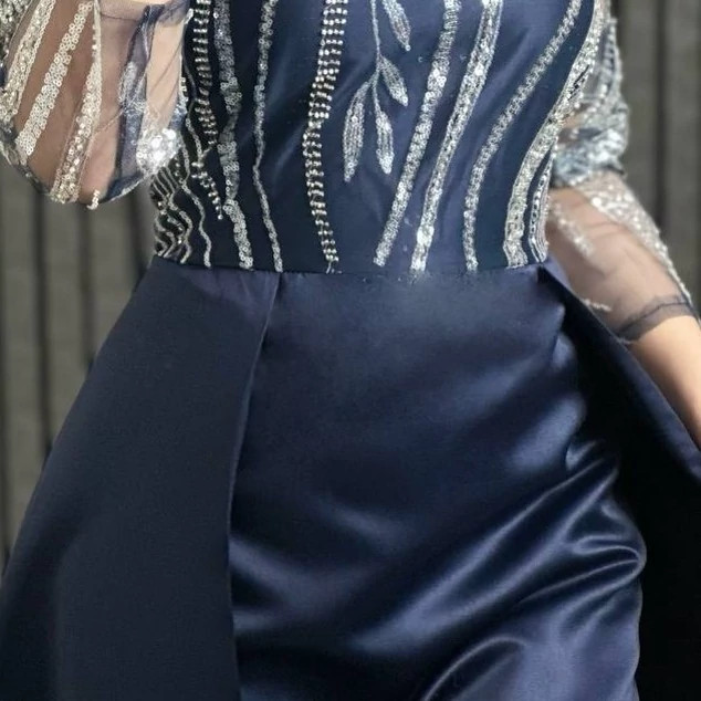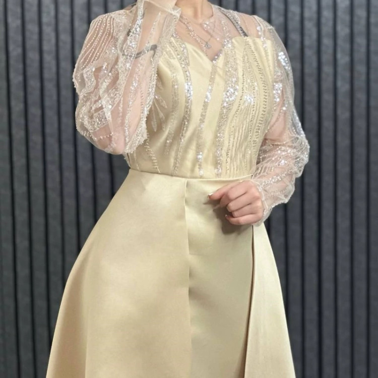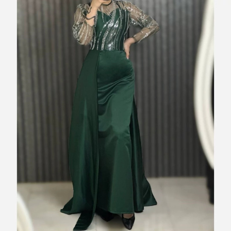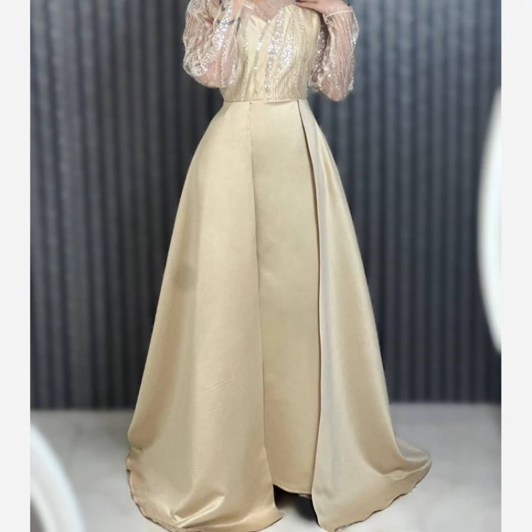 لباس مجلسی زنانه پوشیده مزونی تور منجوق دوزی و ساتن آمریکایی مدل ملودی