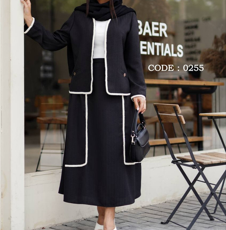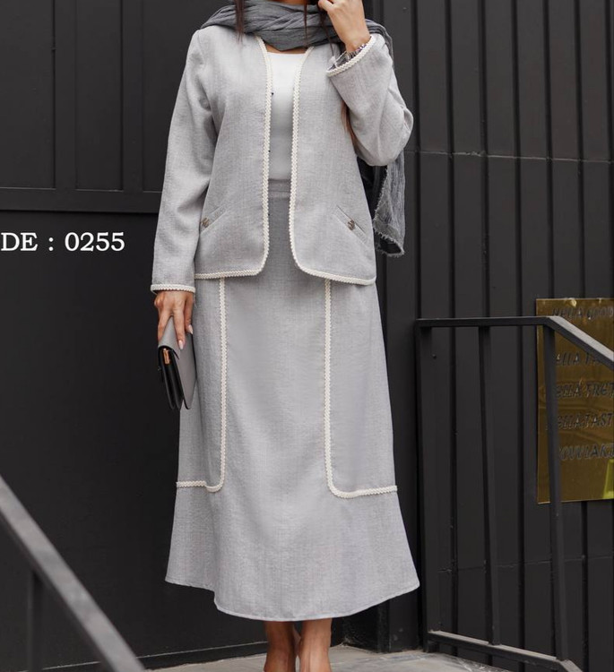 • جزئیات دوخت: نوار دوزی حرفهای در حاشیه کت، سرآستین و نمای جلوی دامن