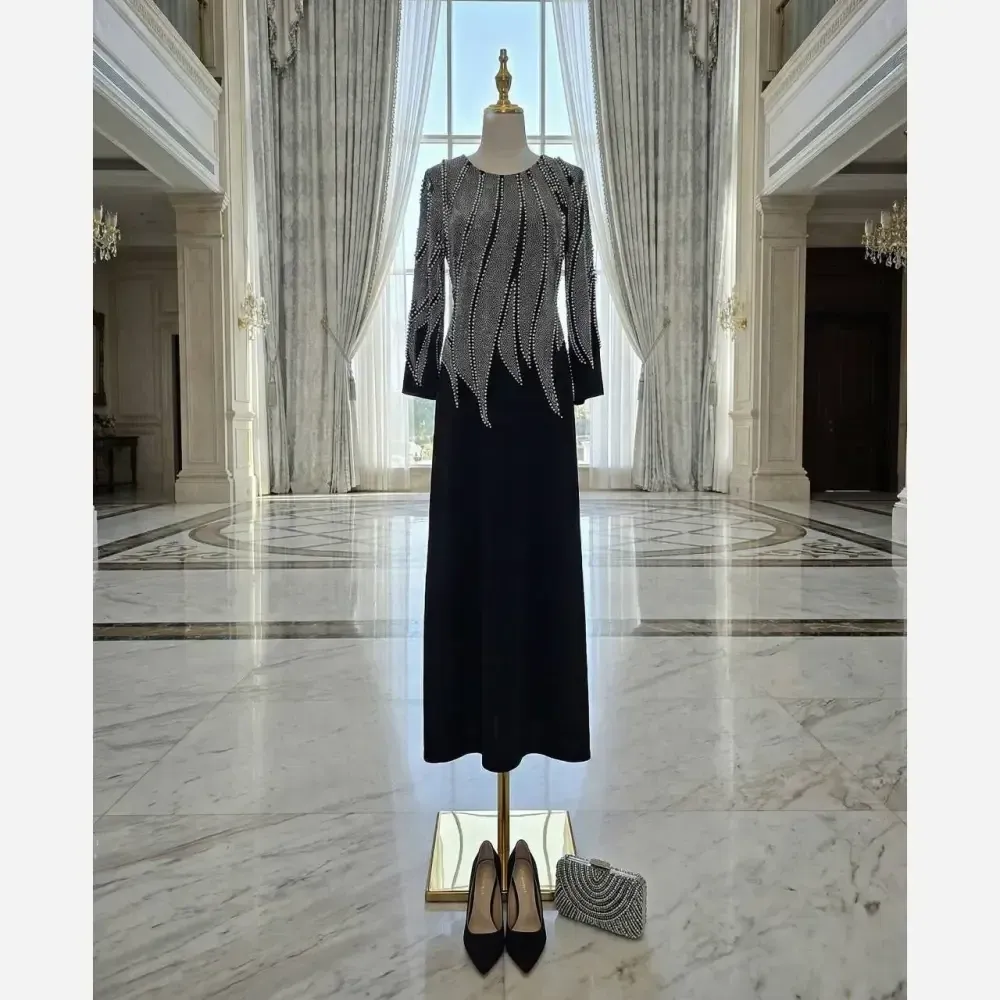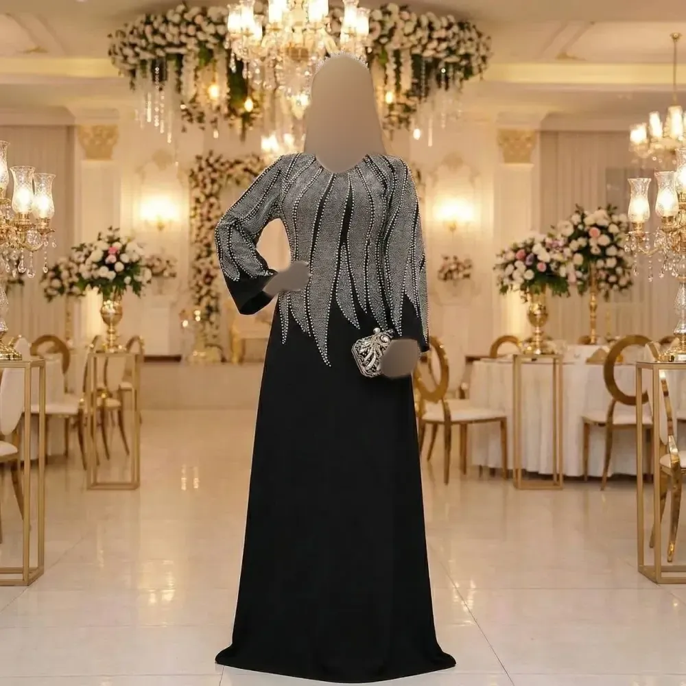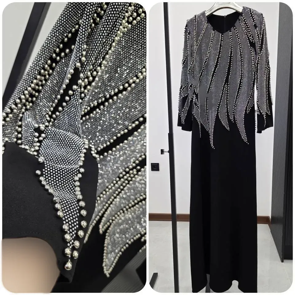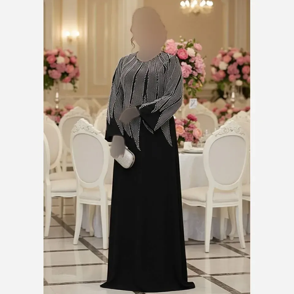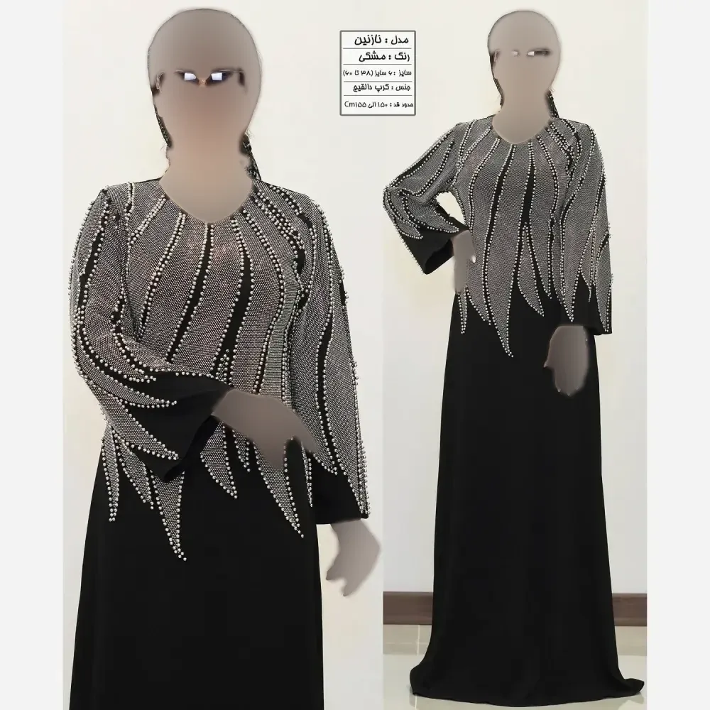 ماکسی مجلسی مدل نازنین بیگ سایز مشکی کرپ دالقیچ با نگین و مروارید قد 150-155